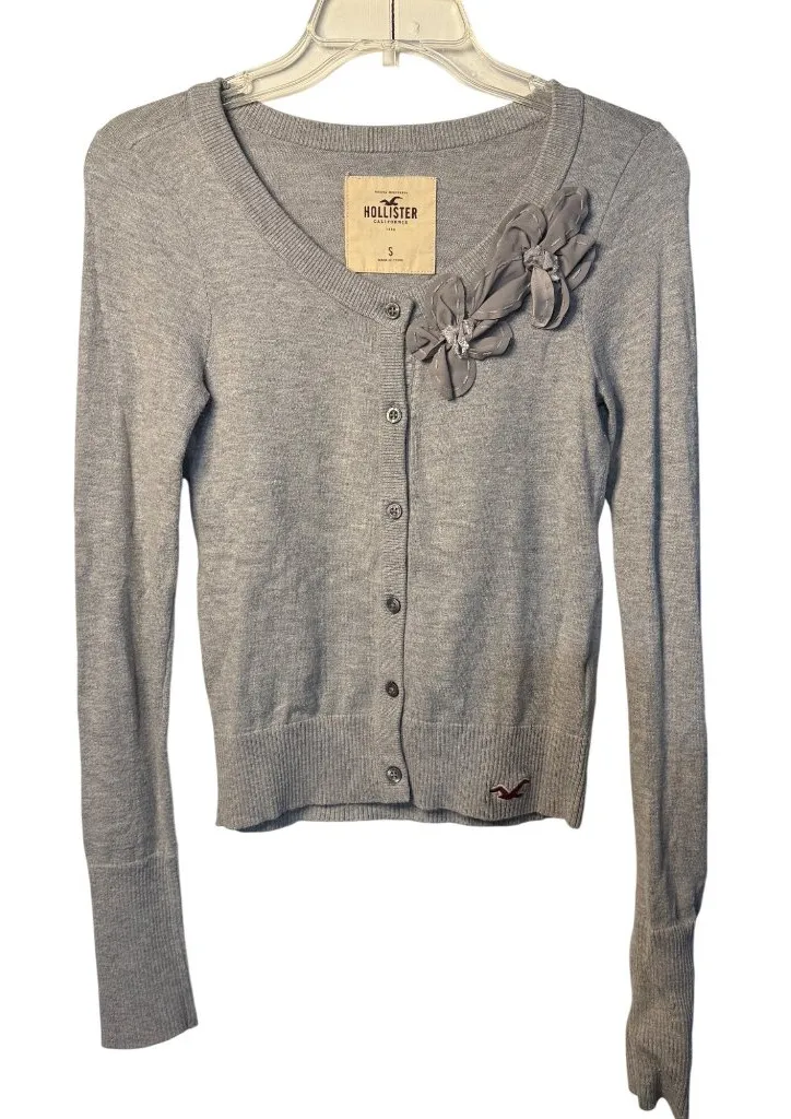 Vintage Hollister small gray knit cardigan featuring a flattering V-neck and floral applique. Lightw... Show more