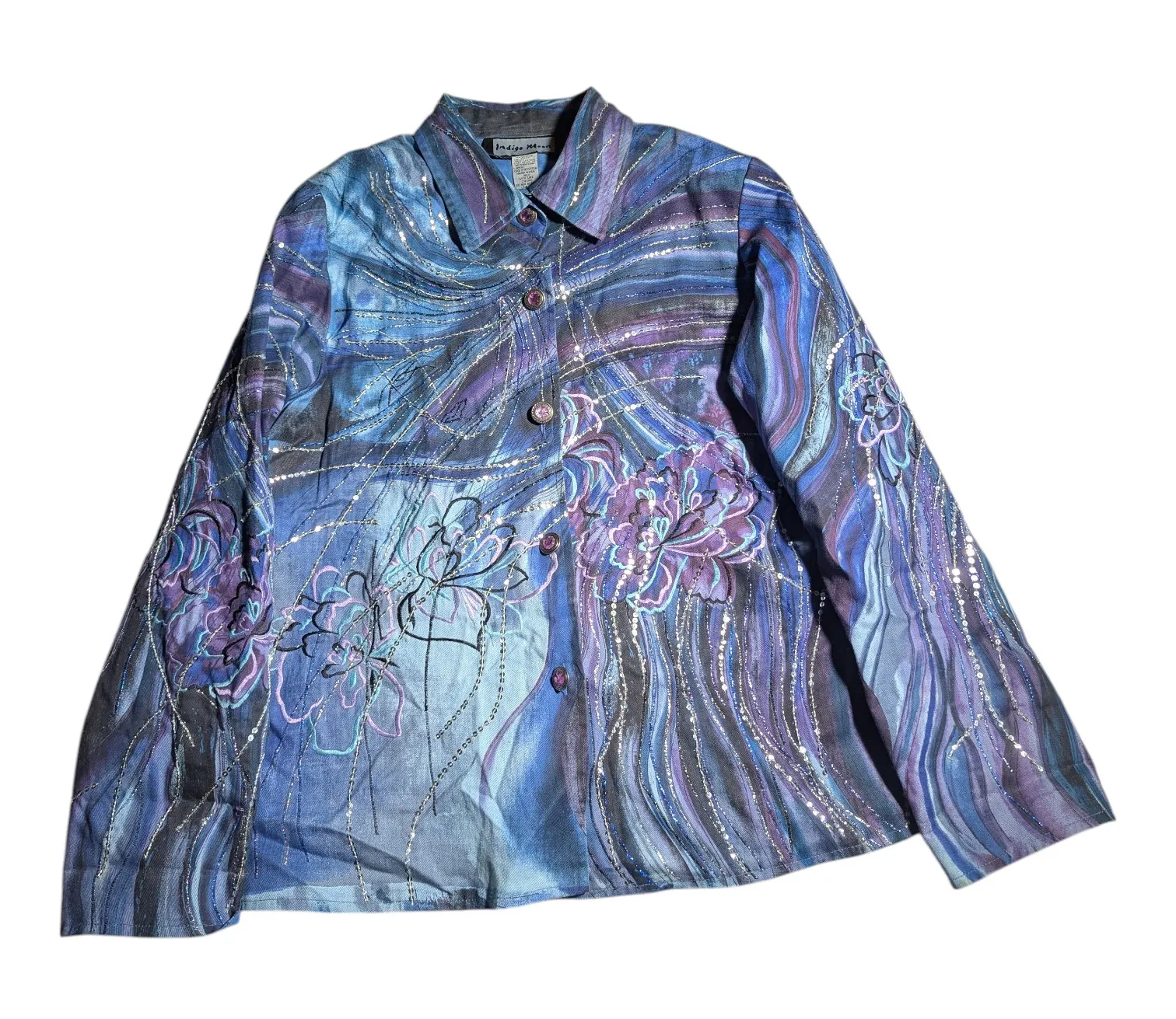 Blue and purple abstract watercolor patterned collared button up lightweight jacket with floral embroidery and sequin detail, from Indigo Moon. Vintage circa the early 2000s. Excellent gently used condition. Bust: 21" flat Length: 25"