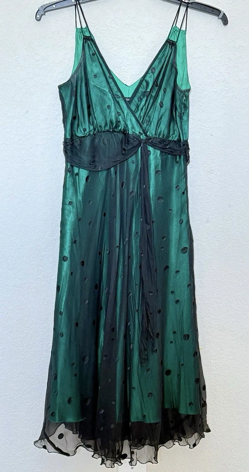 VTG Y2K Jonathan Martin Dress in emerald green silk with black sheer mesh polka dot detailing is a b... Show more