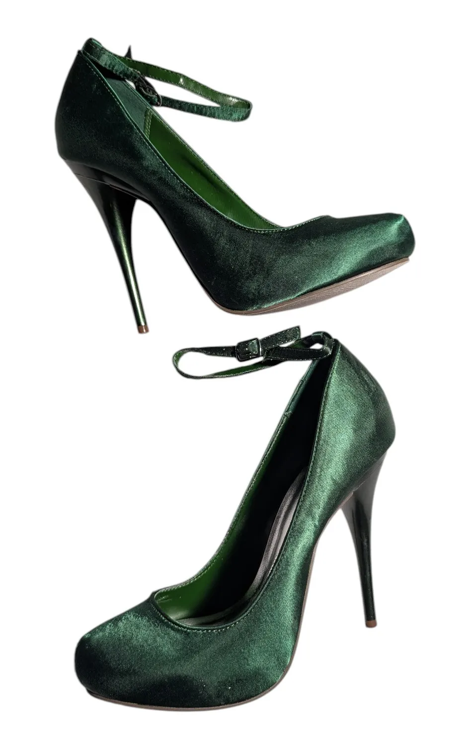 Emerald green satin pumps with a buckling ankle strap and 5" metallic spike heel, from Michael Antonio. Vintage circa the early 2000s. Like new condition, no flaws or signs of wear.