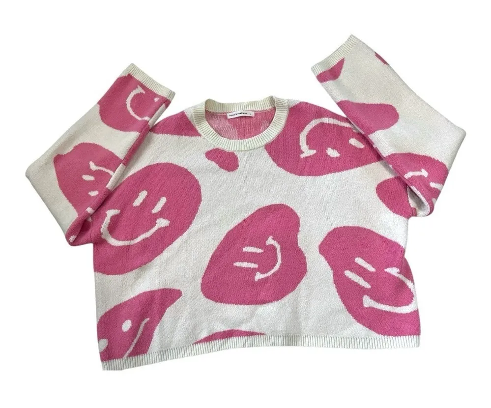 Vtg Y2K Moon & Madison Oversized Cropped Smiley Face Pink Sweater L Dopamine • Brand:... Show more