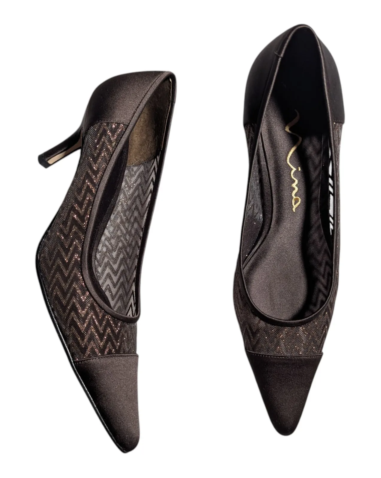 Brown pointed toe pumps with a satin cap toe and heel, glitter chevron patterned mesh sides, and a 3" stiletto heel, from Nina. Vintage circa the early 2000s. Excellent gently used condition.