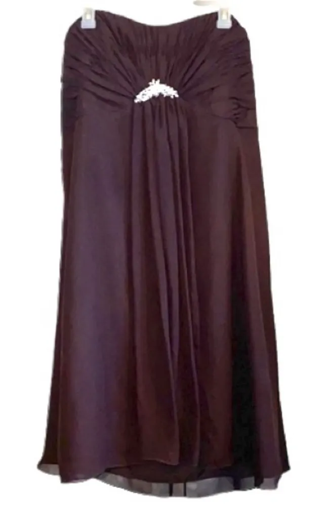fun brown party dress . Features a silver / rhinestone embellishment at the neckline. sheer layers r... Show more