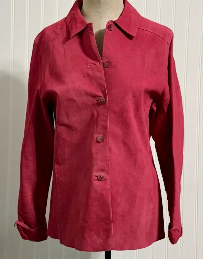 A stunning genuine suede leather jacket from the Y2K era by Valerie Stevens. This piece features a beautiful, deep "Berry" or "Rose" pink color that is much richer and more wearable than a bright hot pink. It is made from 100% leather suede with a smooth, soft hand feel. The silhouette is a classic button-front "shacket" (shirt-jacket) style with a structured collar and cuffed sleeves. It’s fully lined and perfect for transitioning between seasons. A rare color find that fits both a "Western Chic" and "90s Minimalist" wardrobe. Excellent pre-owned vintage condition. Suede is soft with no major stains or bald spots. Vintage pink suede jacket womens medium leather coat berry rose dark pink 90s style y2k fashion valerie stevens department store brand western cowgirl boho bohemian soft leather shacket button down coat dopamine dressing barbiecore classic career wear.