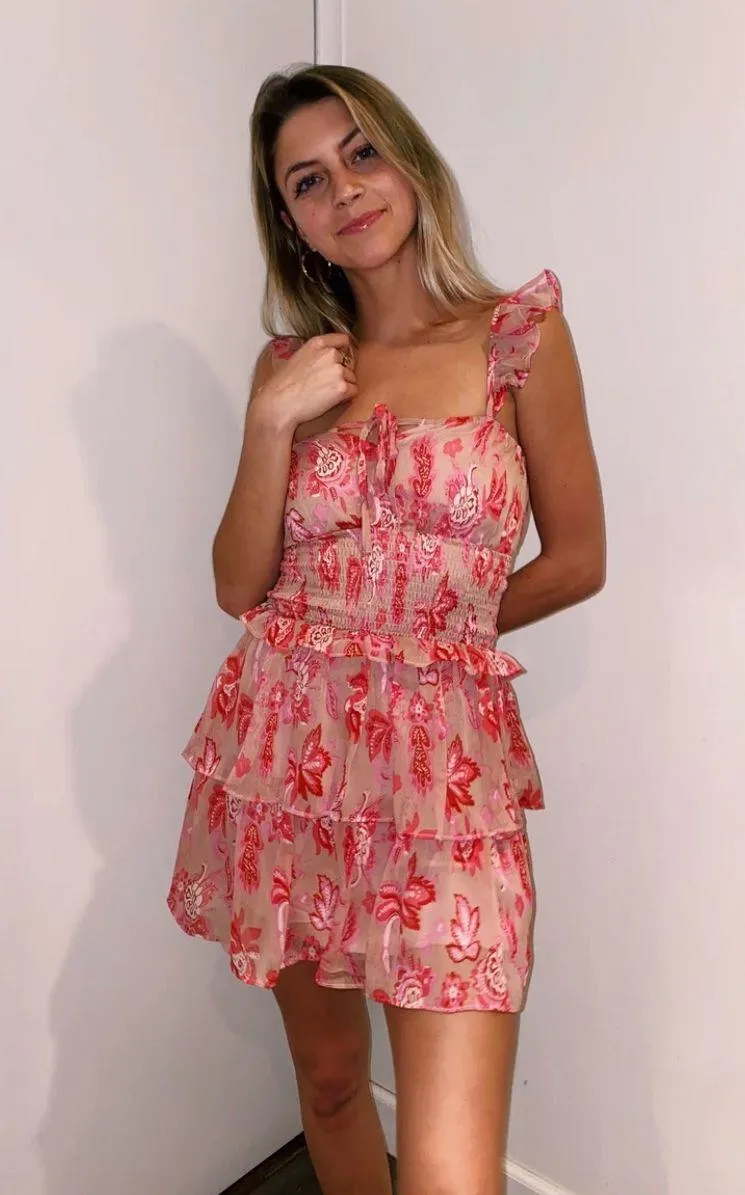 •Pink, red, & tan floral print dress •Ruffle sleeves w/ adjustable straps •Stretchy smocked waist •S... Show more
