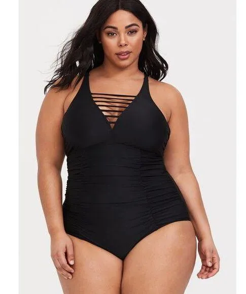 Torrid Wireless Ladder Front One Piece Ruched Swimsuit in Black. A wireless swimsuit has mod-chic ac... Show more