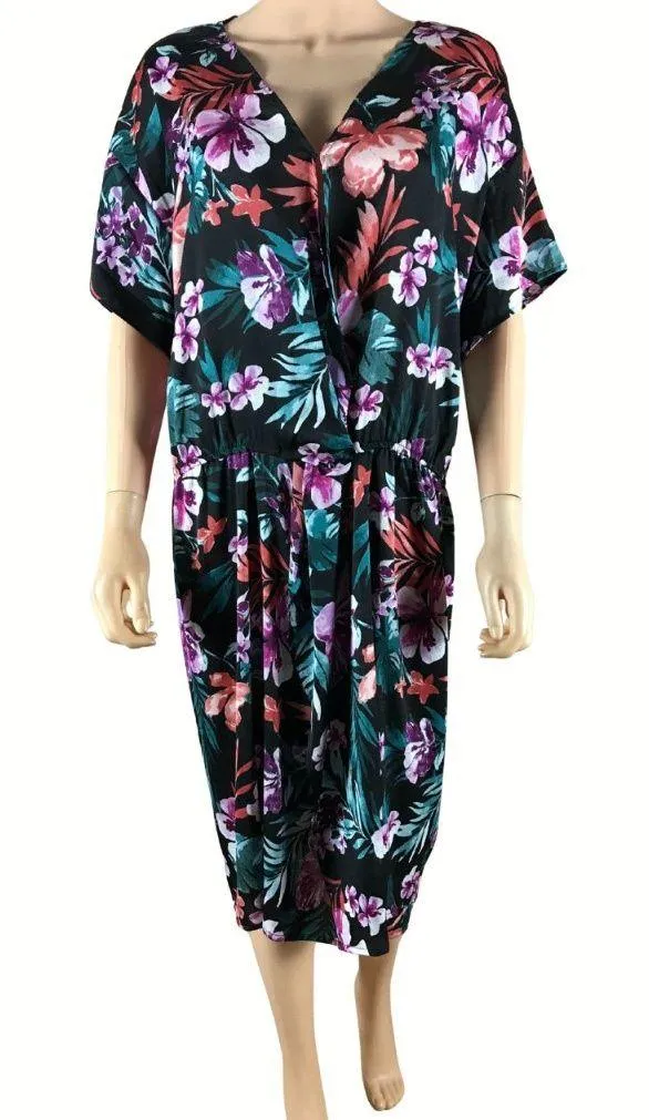 BOBEAU Satin Twist Front Black Floral-Print Dress Crossover V-neck, short sleeves Elasticized waist with front twist detail, side slit pockets Asymmetric front hem, pullover style, unlined Crepe woven Polyester; not lined Size: Medium Approximate Measurements: Armpit to armpit 21" Length 37"