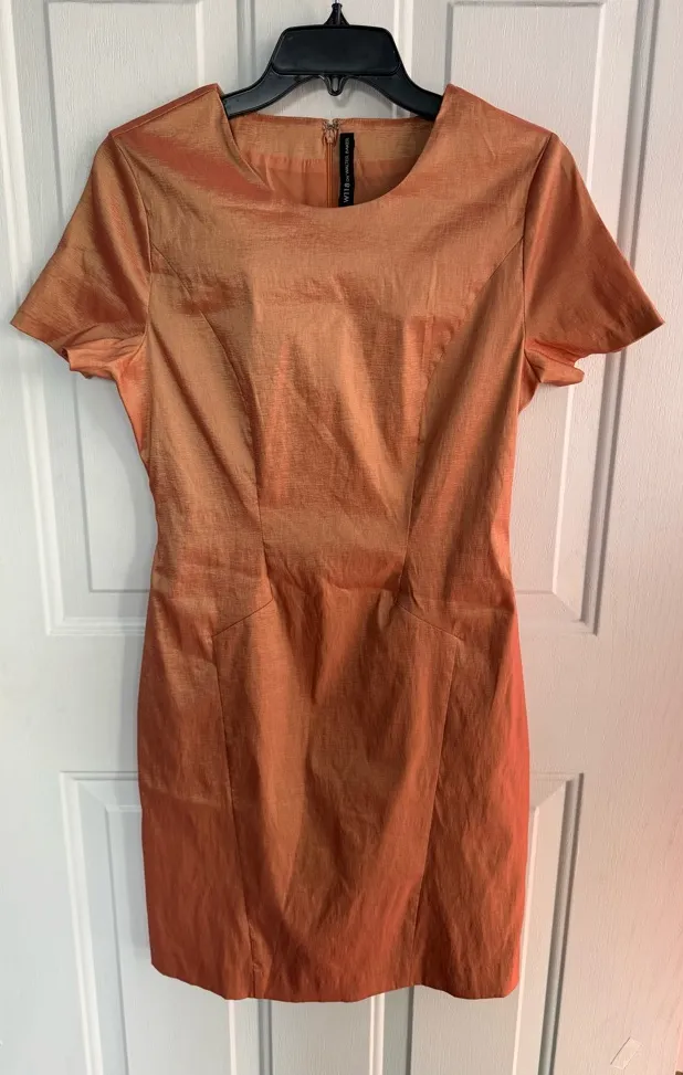 NWOT. Elegant W118 by Walter Baker satin sheath dress in a stunning peach/copper tone with a subtle shimmer. New without tags. Short sleeves, invisible back zipper, and fully lined for comfort and structure. Perfect for cocktail parties, formal events, work functions, or special occasions. Approximate Measurements: • Bust: 16.4 inches • Waist: 14 inches • Hips: 18 inches • Length: 37 inches Material: • Shell: 50% Polyester, 36% Nylon, 4% Spandex • Lining: 97% Polyester, 3% Spandex Care: Dry clean only.
