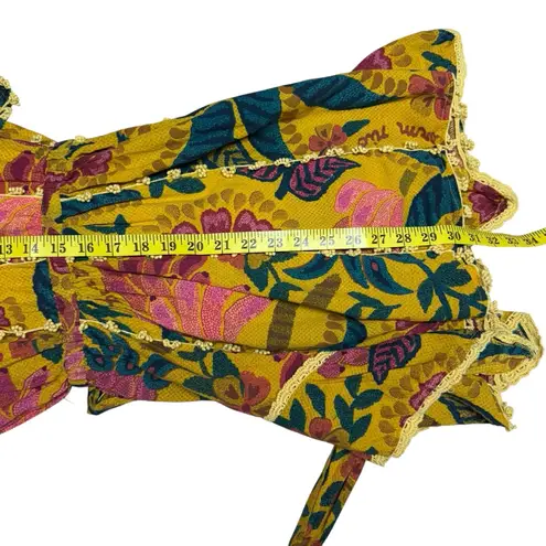 This cotton minidress is decorated with ruffle details and a colorful floral print. High collar. Ruffle shoulders. Three-quarter length sleeves. Tie-waist. Back button-and-loop closure. 100% cotton Lining: 100% cotton Tags: sundress, floral, bright, colorful, sun dress, tropical, summer, spring, ruffle, preppy, boho, bohemian, vacation, mini, ruffle, feminine, special occasion, party, printed, pattern, print •Pre-owned excellent condition All measurements are on the pictures above. •5065-1.00