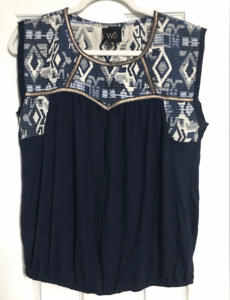 . Preowned in good condition Pit to pit 18” across Length 24” Embroidered Aztec western boho pattern with metallic bronze looking stitching Funky cool shirt great detailing Elastic waist