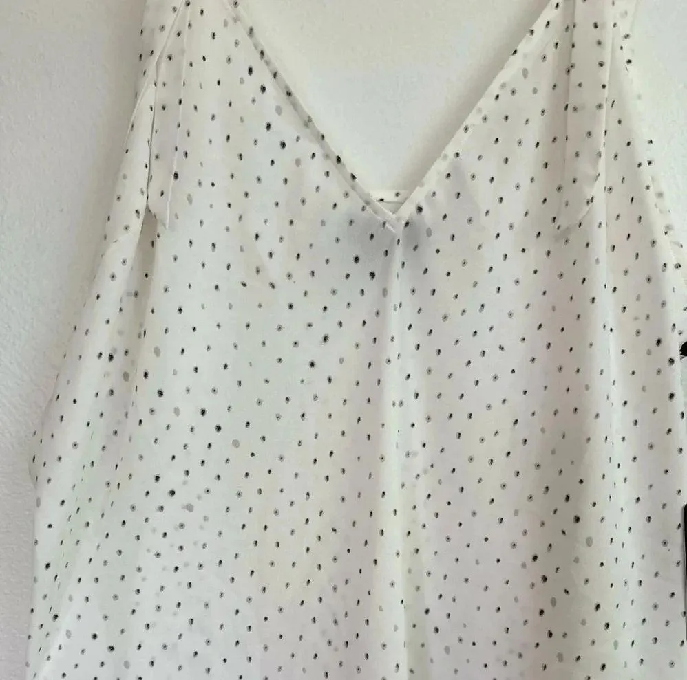 Size XXL New with Tags Styled with dangling straps that gently sway as you move, this lightweight tank cut from smooth crepe makes a cool, modern choice for drinks or date night. V-neck 100% polyester Machine wash, dry flat In great condition. Color: White Snow Odd Dots