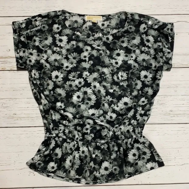 Size medium. Michael Kors gray daisy print blouse features cuffed cap sleeves with buttons and elast... Show more