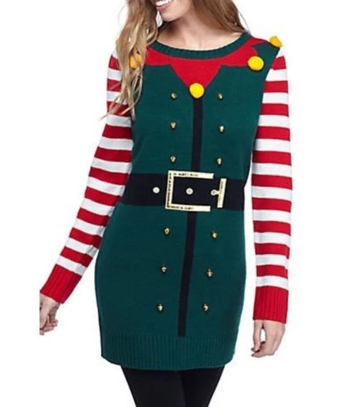 New without tags. New Directions Elf Ugly Christmas Tunic Sweater with Bells Size XL. Green sweater made to look like an elf costume. Red color with yellow 3D balls. Black belt. Red and white striped sleeves. Gold bells down the front. Never worn. Polyester. Approx. measurements Chest 21.5" across laying flat. Length 33.5" L holiday, Christmas, party, elf