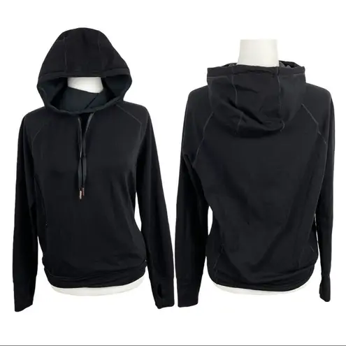 Sweaty Betty Rhythm Merino Black Hoodie. Silky soft. Goes with everything and has beautiful rose gold details. Amazing quality. Merino wool will keep you warm without bulky feel. Drawstring hood and Thumbhole cuffs Size Small •Pit to pit: 20" flat across •Length: 23" •Pre-owned excellent condition All measurements are approximated Fast shipping! Bundle up! Offers always welcome! •2050