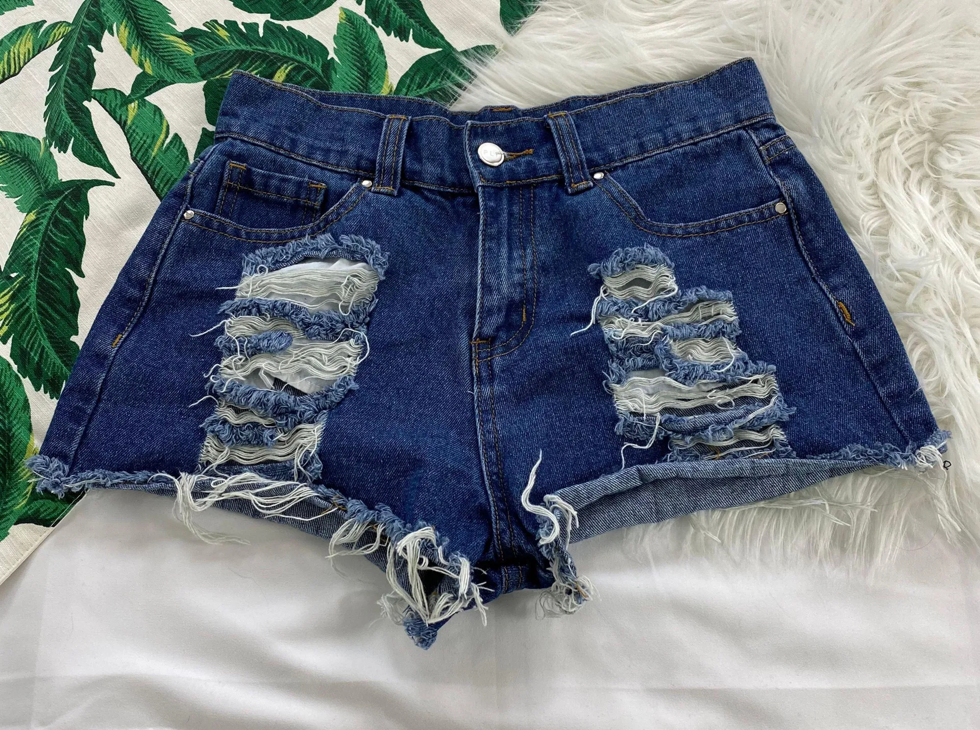 -Good preowned condition -Approx. Measurements: Waist: 13.5” Hips: 16” Rise: 10” Inseam: 2” -No t... Show more