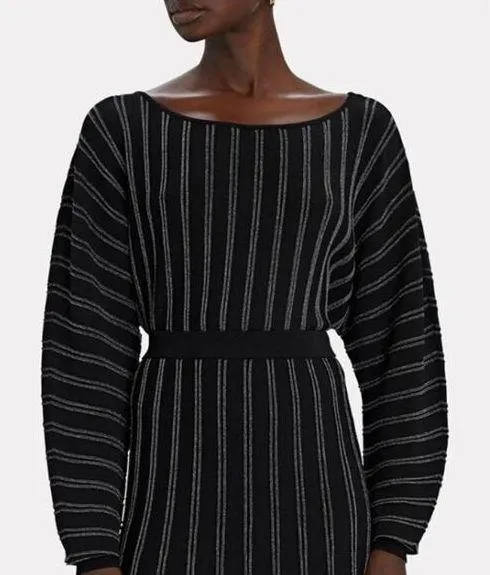 Intermix Jessa Metallic Striped Bateau Neck Dolman Sleeve Crop Sweater in Black. Knit along a bateau neckline, our exclusive Jessa sweater is a cozy staple in tactile stripes. Rib knit cuffs and hem. Great used condition, but does have a run line on back of arm as shown in last photos. Size: P or XS Bust: 17" Length: 18.5" Tags: fall, winter, dolman