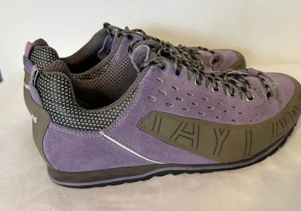 Kayland Comet Approach Shoes – Women’s Size 8.5W These Kayland Comet approach shoes are built for technical trails and rugged terrain. The purple suede upper with mesh panels offers both durability and breathability, while the Vibram sole ensures superior traction on slippery or uneven surfaces. Designed with a rubber toe cap and heel stabilizer for extra protection and support. Perfect for hiking, approach climbs, or any outdoor adventure.