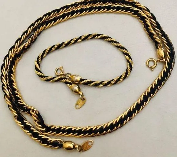 Beautiful unique Vintage 1980s TRIFARI Black Rope Woven in Gold Tone Chain Bracelet and Necklace Set... Show more