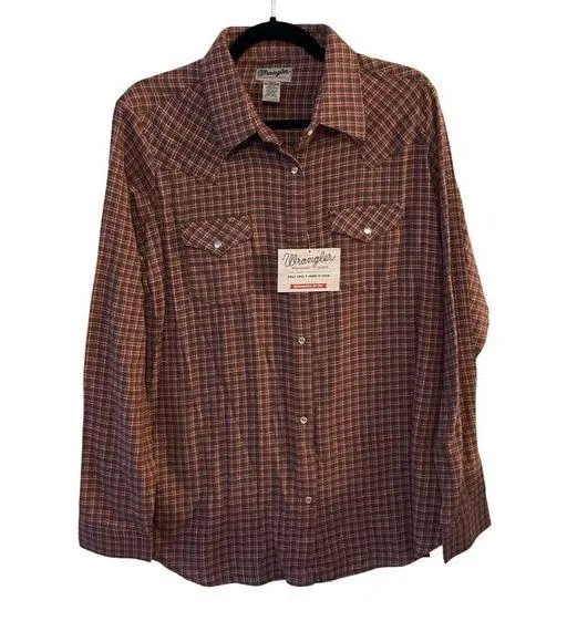 The Wrangler Wrangler Shirt is a women's button-up top in size XXL, featuring a pink and brown plaid... Show more
