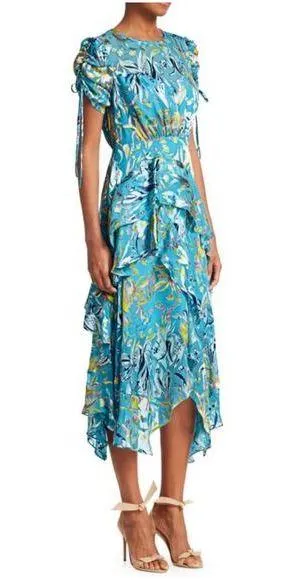 Tanya Taylor Cosette Floral Ruffle Silk-Blend A-Line Handkerchief Dress. Size 4. In great pre-owned condition. Tiered ruffles lend romantic textures to this vibrant floral print dress. Roundneck Short drawstring sleeves Ruched drawstring and keyhole button back closure Tiered ruffled skirt Handkerchief hem Retail $595 Tags: Southern Charm, Nashville, Sophisticated, luxury, luxurious, Preppy, Brunch, Day Date, Spring, Summer, statement piece, bright, spring, travel, vacation, Easter, art deco, tropical, vaycay, party, island, fiesta, happy hour, brunch, bachelorette, girls night out, casual fun, pool, beach, real housewives, yacht, rich, resort, Hamptons, Martha’s Vineyard, Kentucky Derby, Run for the Roses, Oaks, Race, cutesy, demure