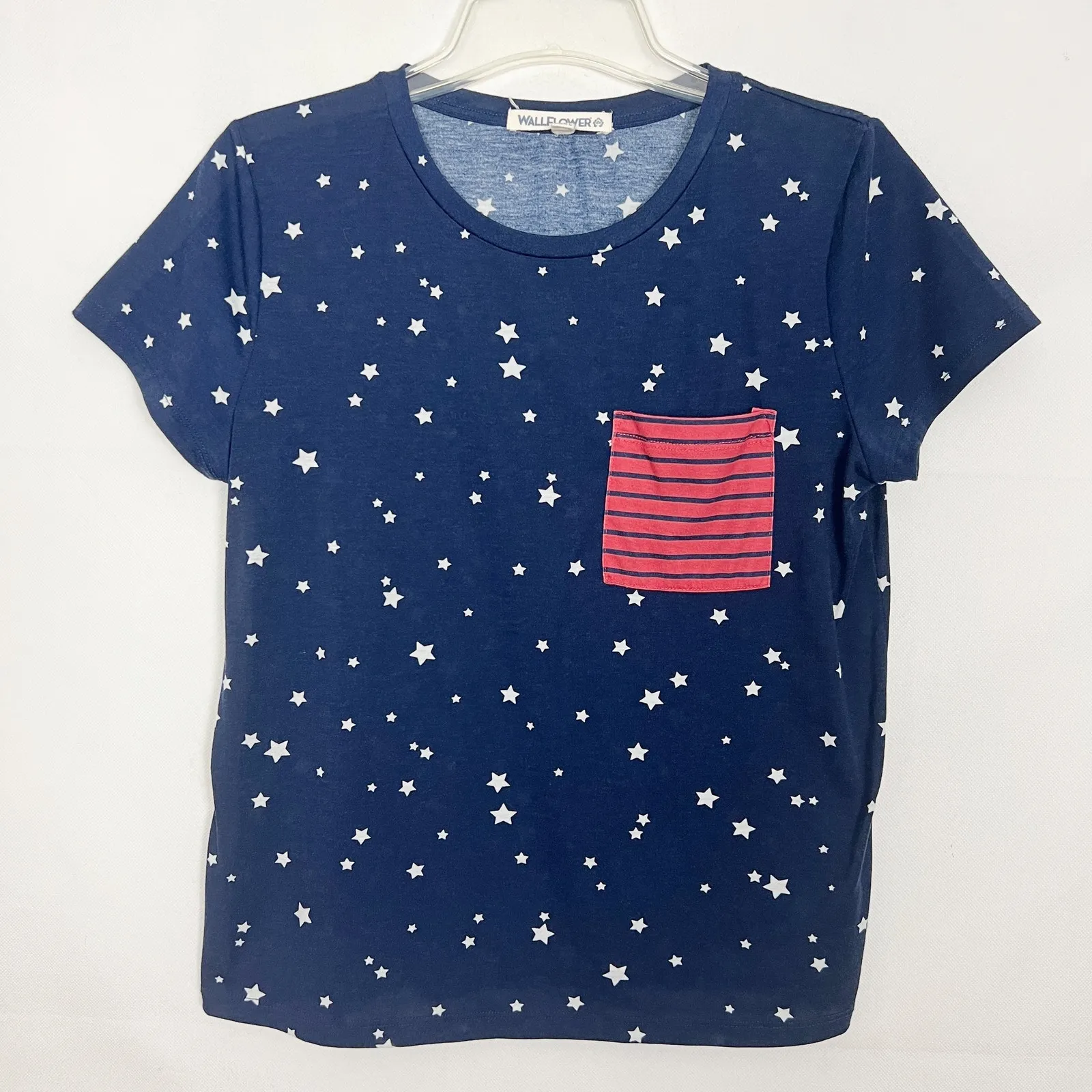 Wallflower star print top in navy blue and white. Round neck. Short sleeves. Contrasting striped chest pocket. Lightweight. In good used condition. No stains, tears or holes. Polyester spandex blend. Machine wash. spring summer patriotic 4th of July festival holiday rodeo western southwestern cowboy cowgirl Texas Girl