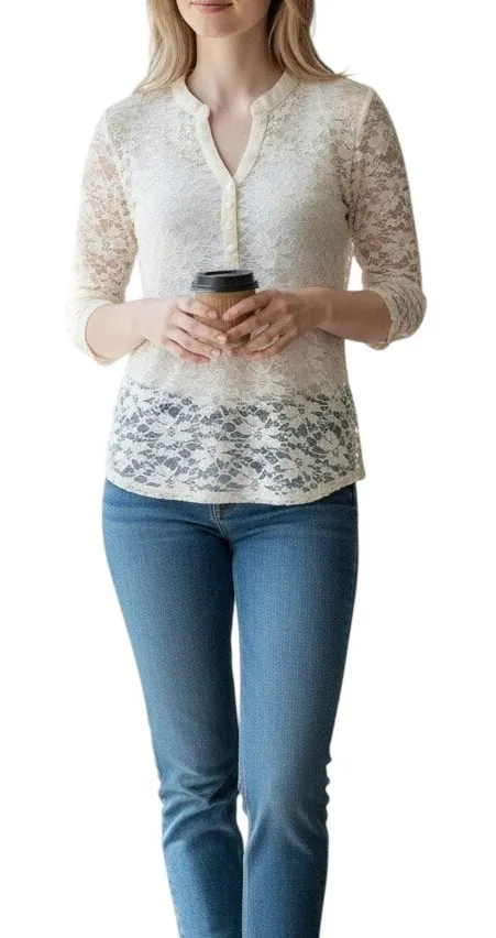 Sheer, bold, and built to layer. Wallflower white lace henley shirt in size Medium with a completely see-through construction designed for impact. Lightweight stretch lace delivers a fitted, flattering drape without stiffness. Features a 3-button V-neck henley front, roll-tab sleeves, and a high-low hem that adds movement and edge. This piece is made to be styled—over bikinis, bralettes, bandeaus, or crop tops. Perfect for beach coverups, festivals, concerts, vacations, or Y2K-inspired streetwear. Clean, striking, and unapologetically sheer. Excellent pre-owned condition. Color: white Fabric: 88% polyester, 12% spandex Fit: fitted with stretch Details: sheer lace, henley neckline, roll sleeves, high-low hem Measurements flat lay approx: Bust: 15” Front length: 25” Back length: 27” Sleeve length: 14” sheer lace top, white henley shirt, beach coverup top, festival sheer blouse, Y2K lace shirt, layering top #Wallflower #SheerTop #LaceTop #BeachCoverup #FestivalTop #HighLowHem #Y2KFashion #SummerLayering