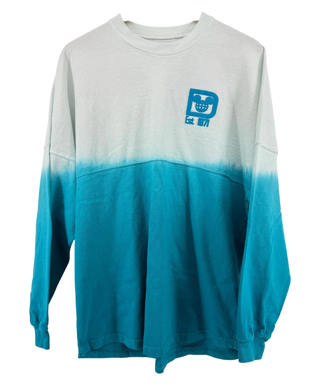 - Walt Disney World Long Sleeve Spirit Jersey - Teal/White Ombre Dip Dye - Women Medium - 100% cotton - In good pre-owned condition. Has some wash wear and small spot on back (unsure if stain vs part of dyeing process). See photos for condition. Approximate flat measurements: Pit to Pit: 24" Shoulder (Seam to seam): 33" Length: 29" You will receive exact item pictured. From smoke free home. Ships from Orlando, Florida Keywords: WDW, walt disney, walt disney world, disney parks, spirit jersey, comfy, oversized, long sleeve, logo, mickey, minnie