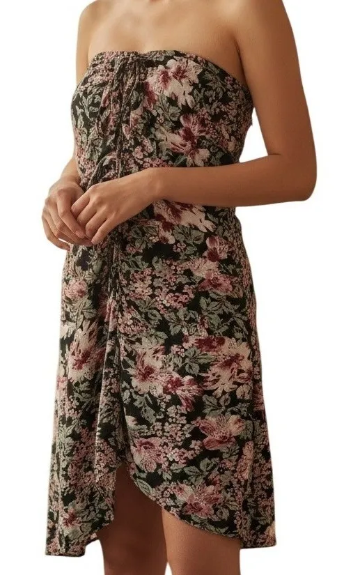 Brand New Without Tags - Retail $188 Strapless Draped and Pleated Front to Waist With Drawstring Hidden Zipper and Eye Hook Left Side Seam High Low Shorter in Front With Slit Main Color is Black Floral Pattern in Pinks, Mint Green and Redwood Brown 100% Polyester Hand Wash Size 4 Armpit to Armpit 32" - Length 22" - 29 1/2" All items are measured lying flat
