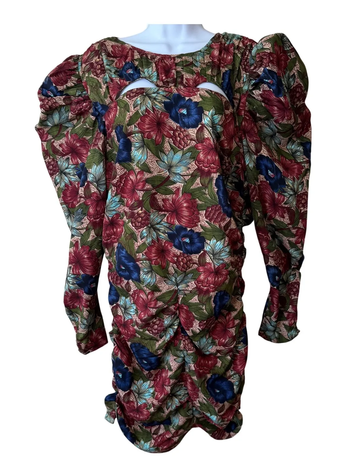 Make a statement in this captivating Walter Baker floral mini dress. The vibrant, all-over floral print bursts with rich hues of deep red, bold blue, and lush green, evoking a sense of exotic beauty. Dramatic puff sleeves add a touch of whimsical drama, while the daring cutout at the bodice offers a modern, alluring edge. The ruched detailing cinches the waist and drapes elegantly down the skirt, creating a flattering silhouette that accentuates your curves. Perfect for a garden party, a special evening out, or a stylish brunch, this dress is designed to turn heads and make you feel unforgettable. Style: Mini, Bodycon Dress Length: Short Department: Women Sleeve Length: Long Sleeve Pattern: Floral Occasion: Party/Cocktail Material: 100% Polyester, Polyester Theme: Flower, Tropical, Bohemian Season: Spring, Summer Sleeve Type: Puff Sleeve Closure: Pullover Keywords: Walter Baker dress, floral print dress, ruched dress, cutout dress, puff sleeve dress, mini dress, women's dress size 12, party dress, evening dress, cocktail dress, boho dress, retro dress, vintage fashion, designer dress, statement piece