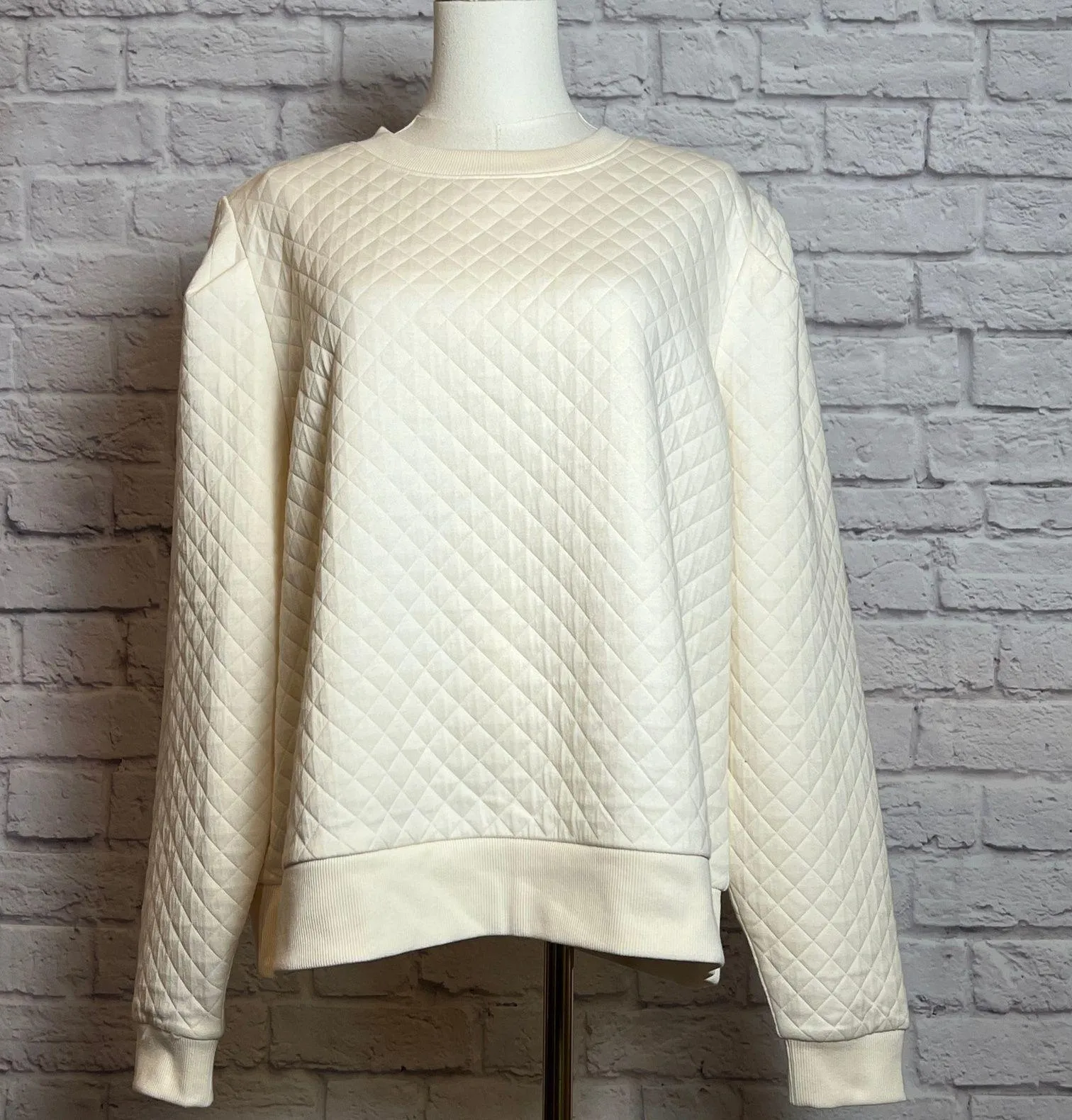 Walter Hagen quilted pullover sweatshirt featuring a diamond quilted texture and soft cotton-blend fabric. Designed with a crew neckline, ribbed trim, and a relaxed fit for everyday comfort. Brand: Walter Hagen Size: Women's XXL Color: White / Ivory Material: 55% Polyester, 43% Cotton, 2% Spandex Style: Quilted pullover crewneck sweatshirt Measurements (approx., laid flat and doubled) Pit to pit: 26 in (52 in) Length (shoulder to hem): 25 in Sleeve length: 27 in Condition: New with temporary tag attached (from Dick's Sporting Goods). women's pullover, quilted sweatshirt, Walter Hagen top, white crewneck, casual athleisure, plus size pullover Disclaimer: Model image created with AI for visualization only.