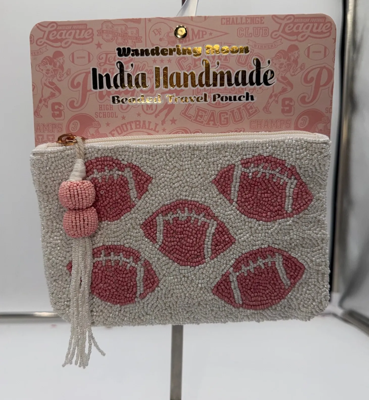 Capture playful spirit with this dazzling beaded travel pouch. Intricate white seed beads form a creamy canvas, brought to life by vibrant pink footballs scattered across the design. A charming tassel with matching pink beaded accents adds a touch of whimsy. This eye-catching pouch is perfect for stashing your essentials for game day tailgates, weekend getaways, or simply adding a pop of personality to your everyday style. Measurements: • Size: 7.75 in W X 5 in H Type: Makeup Bag Material: Glass, Polyester Features: Zipper Country of Origin: India Unit Type: Unit Keywords: beaded bag, football lover, game day, sports fan, travel accessory, cosmetic case, makeup bag, handmade, pink football, seed beads, zipper pouch, designer, gift idea