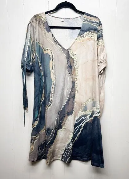 Women's water print tunic dress. V-neck. Short sleeves with tie detail. Knee or midi length. Unlined. Stretch. In good used condition. No stains, tears or holes. No material tag. Rayon or polyester blend feel. casual fall spring boho novelty