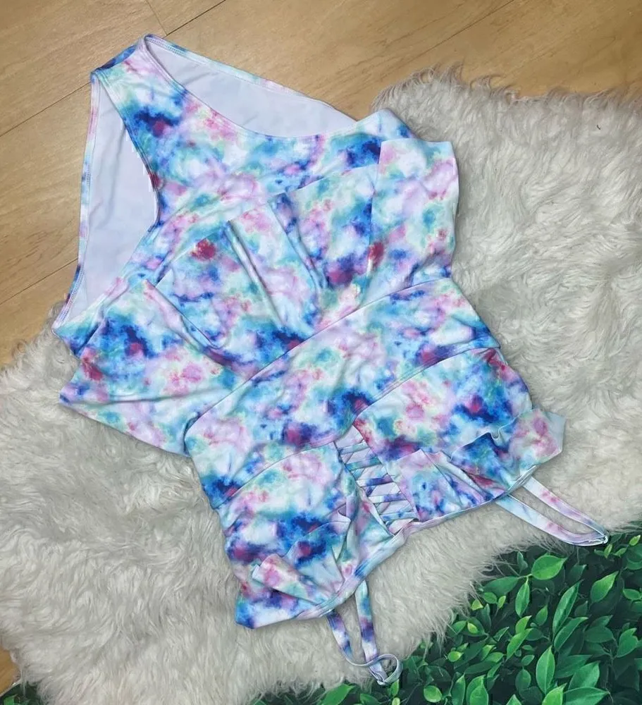 Watercolor ruffled two-piece tank and bikini set swimsuit size XL. This is NWOT. Tankini style swimsuit . Super cute fun colorful. Perfect for summer and spring season. Perfect for the beach and pool parties. Tags: plus size 2 piece tank, blouse, bottom top, swimsuit, swimwear, vacations, travel, modest, colorful, blue, white, red, purple, pink cute ruffled girly.