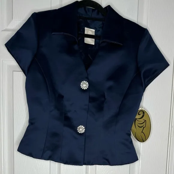 Brand new with tags Vintage piece (made in the USA/paper tag) Navy blue with Rhinestone flower buttons US size 10 (see measurements below) Great for a Mother of the Bride/Groom or a formal gala/event Measurements: Pit to pit: 19” Length: 21”