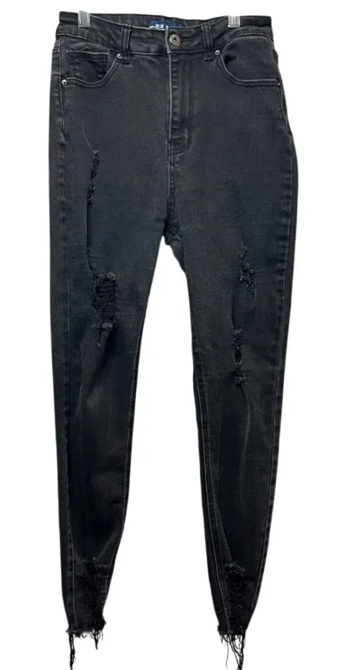 A pair of Wax Jean skinny jeans featuring a stylish distressed design. These jeans offer a modern, edgy look with strategically placed rips and a unique frayed hem. The black wash provides a versatile base, making them easy to pair with a variety of tops and shoes. These jeans are designed to be form-fitting and flattering. Style: Skinny Color: Black Department: Women Type: Jeans Fabric Wash: Dark Accents: Fringe, Button Features: Distressed, Ripped, Frayed Hem, Stretch, High Waisted Pattern: Solid Fit: Skinny Rise: High (Greater than 10.5 in) Fabric Type: Denim Material: Cotton, Polyester, Rayon, Spandex, Cotton Blend Keywords: Wax Jean, skinny jeans, distressed jeans, ripped jeans, frayed hem, black wash jeans, women's jeans, jeggings, casual jeans, denim, high waisted, stylish jeans, modern jeans