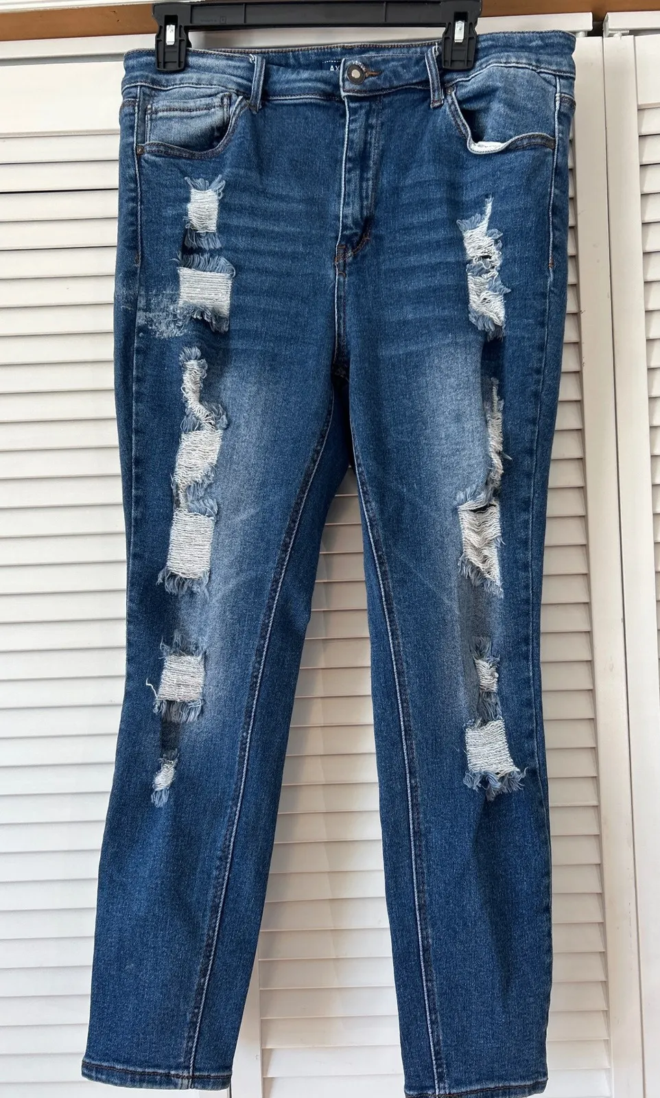 Blue denim skinny jeans with a distressed and ripped design. These jeans offer a stylish and edgy look with strategic rips and a faded wash, perfect for a casual day out or a night on the town. The modern silhouette flatters the figure, making them a versatile addition to any wardrobe. Ideal for concerts, casual Fridays at work, or weekend brunches. Measurements: • Waist: 32 in • Inseam: 28 in • Rise: 10 in Style: Skinny Department: Women Fabric Wash: Medium Accents: Zipper, Button Type: Jeans Features: Distressed, Pockets, Stretch Fit: Slim Fabric Type: Denim Material: Cotton Blend, Spandex Closure: Zip, Button Keywords: WAX+jean jeans, Women's jeans, Size 15 jeans, Blue denim jeans, Distressed jeans, Ripped jeans, Skinny jeans, High rise jeans, Casual jeans, Fashion jeans, Streetwear, Edgy fashion, Trendy jeans