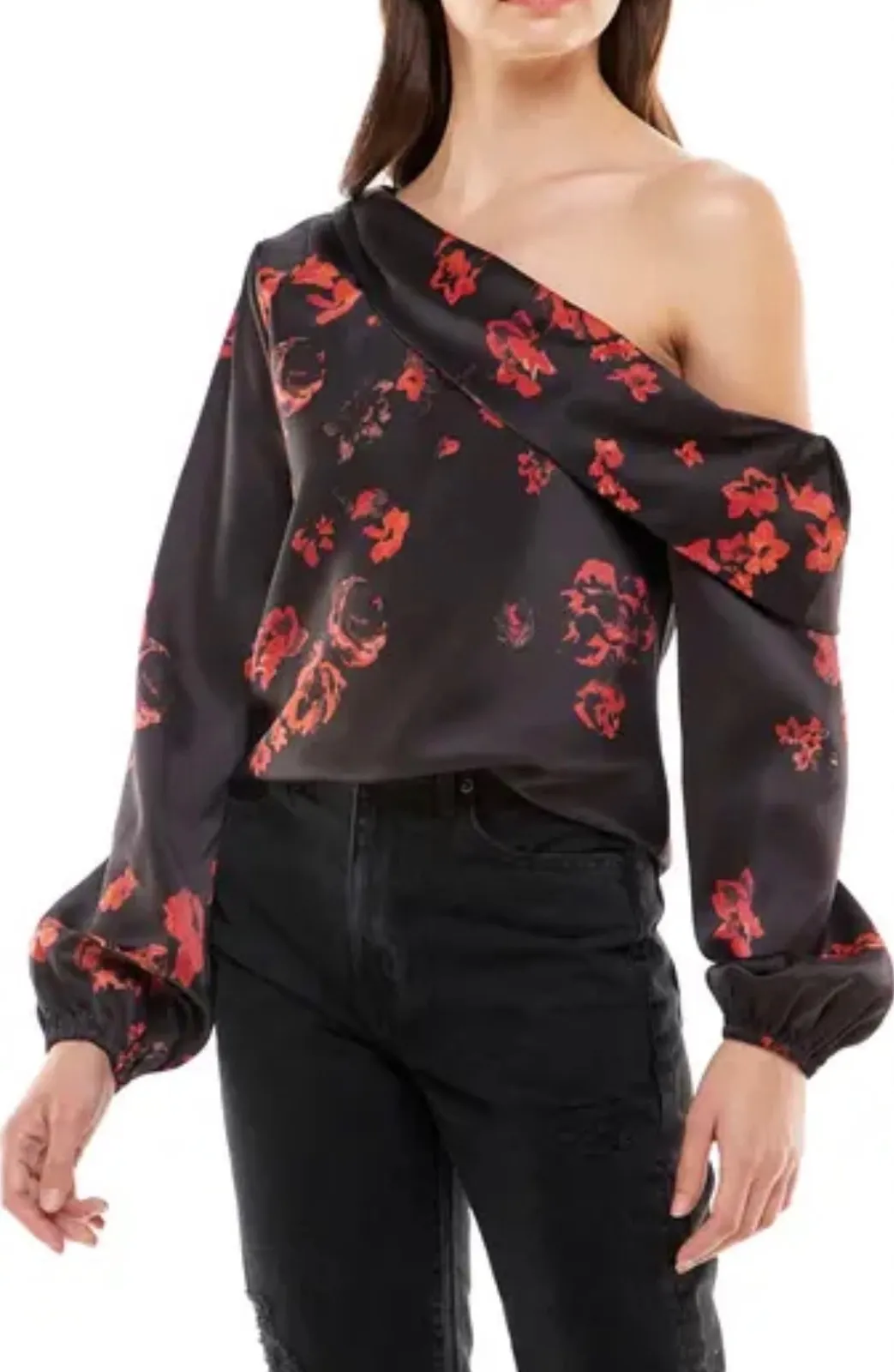Lightly billowed sleeves frame this smooth satiny blouse designed with a folded one-shoulder neckline. • One-shoulder neck • Long sleeves • 97% polyester, 3% spandex • Machine wash, tumble dry • Imported • Item # 6875263 Measurements are approximate. Slight color variations may be seen in pictures due to lighting and camera settings. please see measurements to determine fit. Non smoking dog friendly home Type: Blouse Department: Women Style: Cropped Material: Polyester, Spandex Neckline: One Shoulder Sleeve Length: Long Sleeve Sleeve Type: Balloon Sleeve Pattern: Floral Theme: Rose Fabric Type: Satin Occasion: Casual, Party/Cocktail Closure: Pullover Season: Spring, Fall, Summer Strap Type: Strapless Keywords: WAYF, satin blouse, floral print, off shoulder, red roses, long sleeve, elegant, chic, evening wear, date night, romantic, silky, fashion
