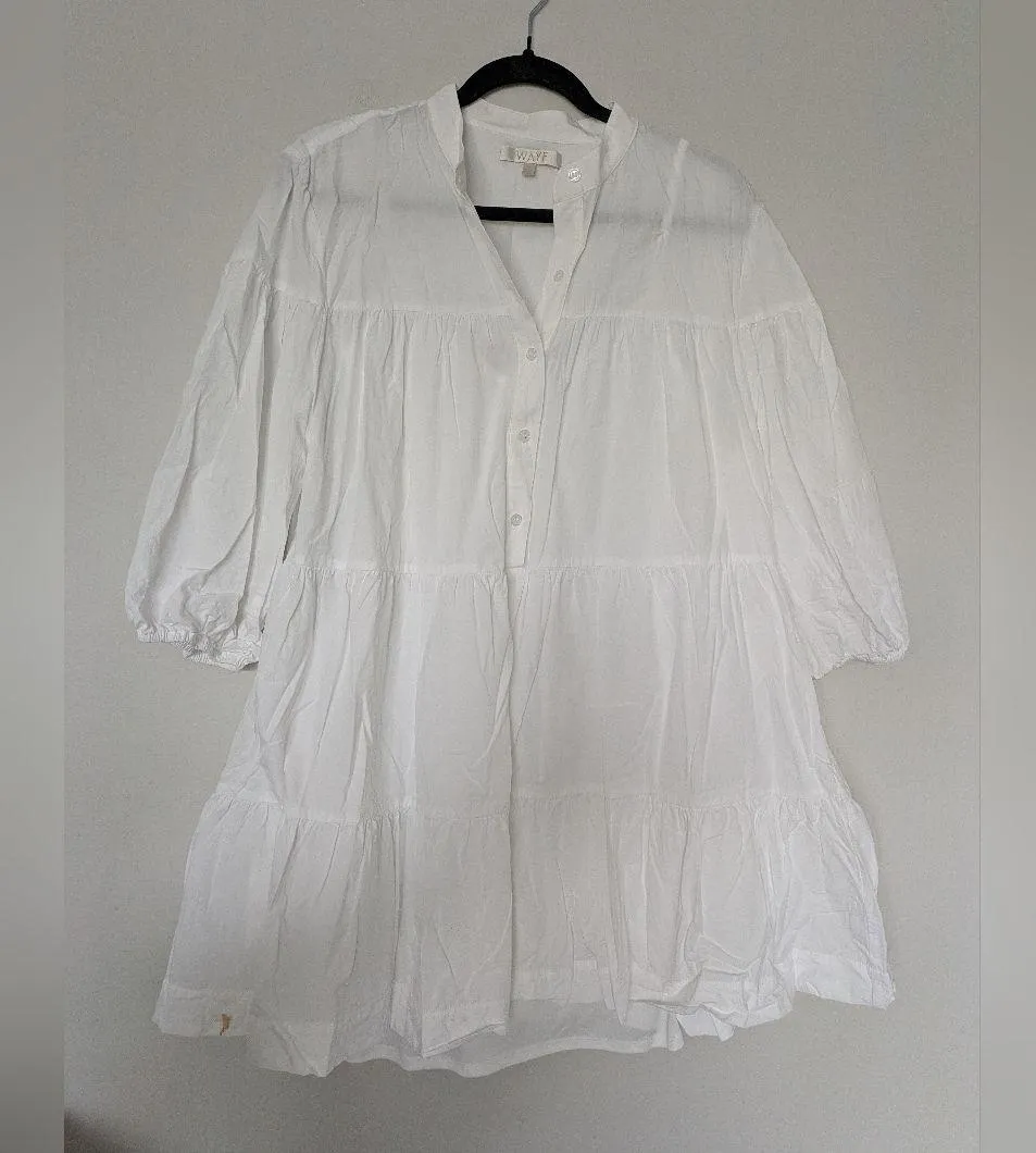Chic white shirt dress with a classic collar. Perfect for any occasion. has slip included- has a mark on the bottom hem from makeup that hopefully a talented person can bleach to remove--