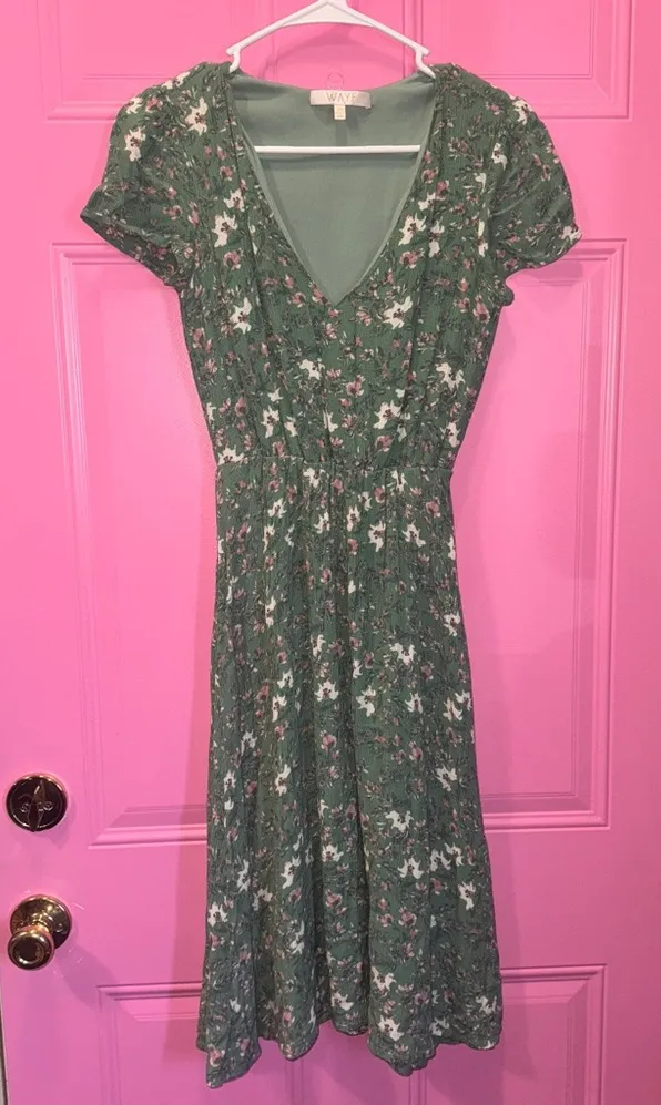 Embrace effortless style with this Wayf dress, showcasing a sinched waist design in a vibrant green shade. The short sleeves and v-neckline enhance its casual elegance, making it ideal for work or leisurely outings. Its midi length and soft fabric ensure a comfortable and flattering fit.