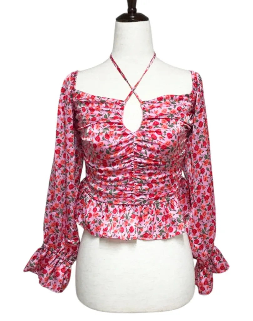 WAYF Pink Red Rose Print Sweetheart Peplum Top Condition: New With Tags Size: Small Sweetheart neckline Convertible neckline can be worn tied in front or halter style Flare sleeve with elasticized cuff Ruched front Smocked back Peplum hem Thanks for looking! Tags: cottagecore, feminine, romantic, colorful, whimsical, Betsey Johnson, coquette, summer, spring