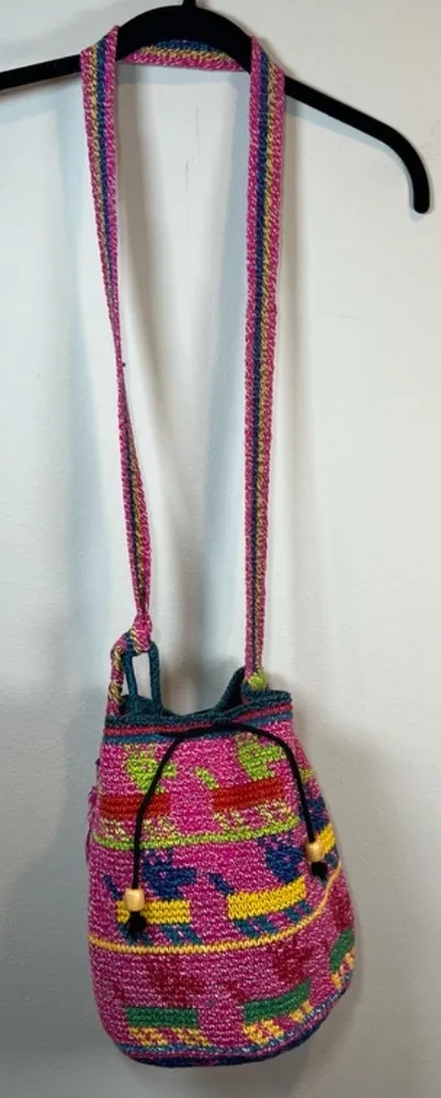 Wayuu Bucket Bag Pink Blue Yellow Green Long Adjustable Crossbody Strap Unlined Drawstring Closure with Wooden Bead Accents Colorful Handmade Unique Vibrant Durable Boho Preowned in excellent condition. No noted flaws. Approximate measurements: unstretched 11 in length, 11.5 in width, 8 in deep, 47 in total strap length SKUT2