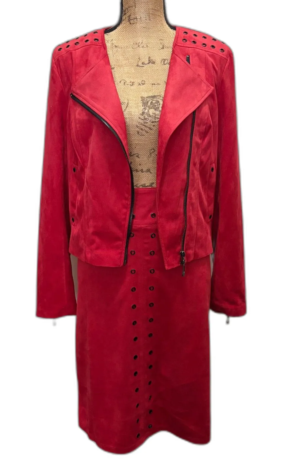 This bold two-piece set by WD·NY features a statement-making faux suede moto jacket and matching pencil skirt in vibrant cherry red. The jacket includes black grommet detailing at the shoulders, asymmetrical zipper closure, and zippered cuffs for edgy flair. The coordinating skirt is high-waisted with vertical grommet accents that elongate the silhouette and add a touch of rocker-glam. Crafted from soft faux suede with a structured yet flexible fit, this set offers both drama and comfort. Wear them together for a head-turning ensemble or style separately to bring texture and attitude to everyday looks. Excellent used condition. Jacket – Bust: 19” | Length: 19” Skirt – Waist: 15.5” | Length: 24” Style keywords: retro glam, rocker chic, biker style, y2k revival, moto jacket, grommet detail, structured silhouette, edgy set, vintage, alt femme Thank you so much for shopping with me, and please let me know if you have any questions! Offers are always welcome. Bundle to save.