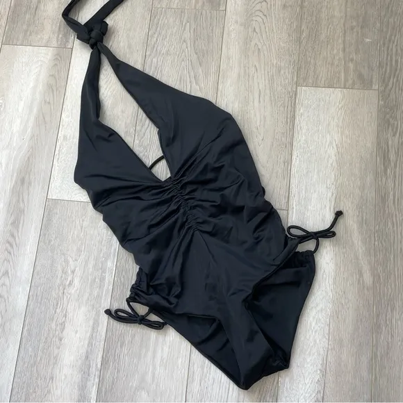 We are Hah (NWOT) Scrunch Halter Strappy One Piece Swim Suit in the color Black. Halter tie strap. Plunge neckline with scrunch detailing. Strappy back ties and side ties. Scrunch detailing on bottom. No padding. Sexy and flattering. New without tags, never worn. Hygienic liner still attached. Size small. **stock photo is just to show what it looks like on. you will receive this bathing suit in BLACK**