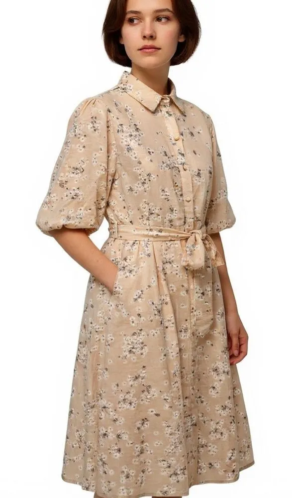 Button-front shirt style with a collared neckline 100% linen Puff half-sleeves with a slightly dropped shoulder Detachable belt with matching fabric buckle Delicate floral print in blush tones Size 10 Excellent condition Pit to pit 21” 18.25” waist 47.5” length (24)
