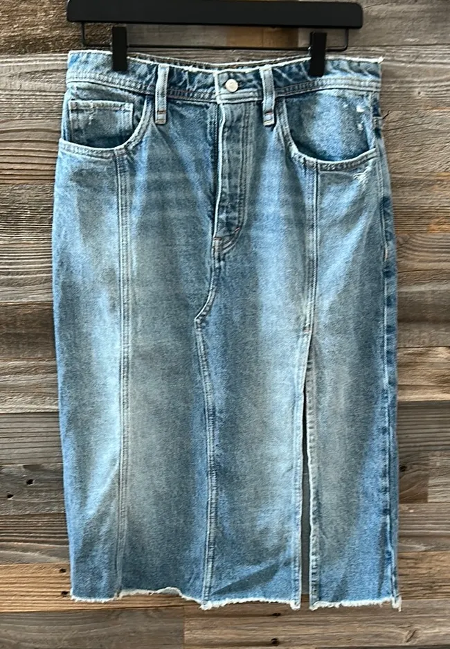 Free People Faded Denim Midi Jean Skirt, size 27 This skirt features a front side slit, and a butto... Show more