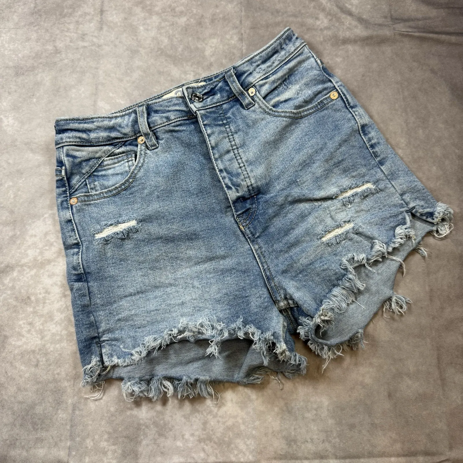 The product is a pair of Free People distressed denim shorts for women in size 26 with a button fly.... Show more