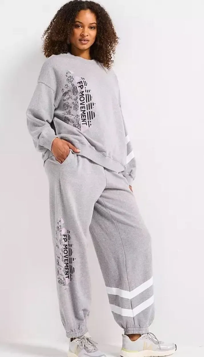 Keywords: FP Movement, Joggers, Sweatpants, Athleisure, Lounge Pants, Heather Grey, Casual, Comfortable, Relaxed Fit, Wide Leg, Drawstring Waist, Side Pockets, Graphic Print, Sporty, Contemporary