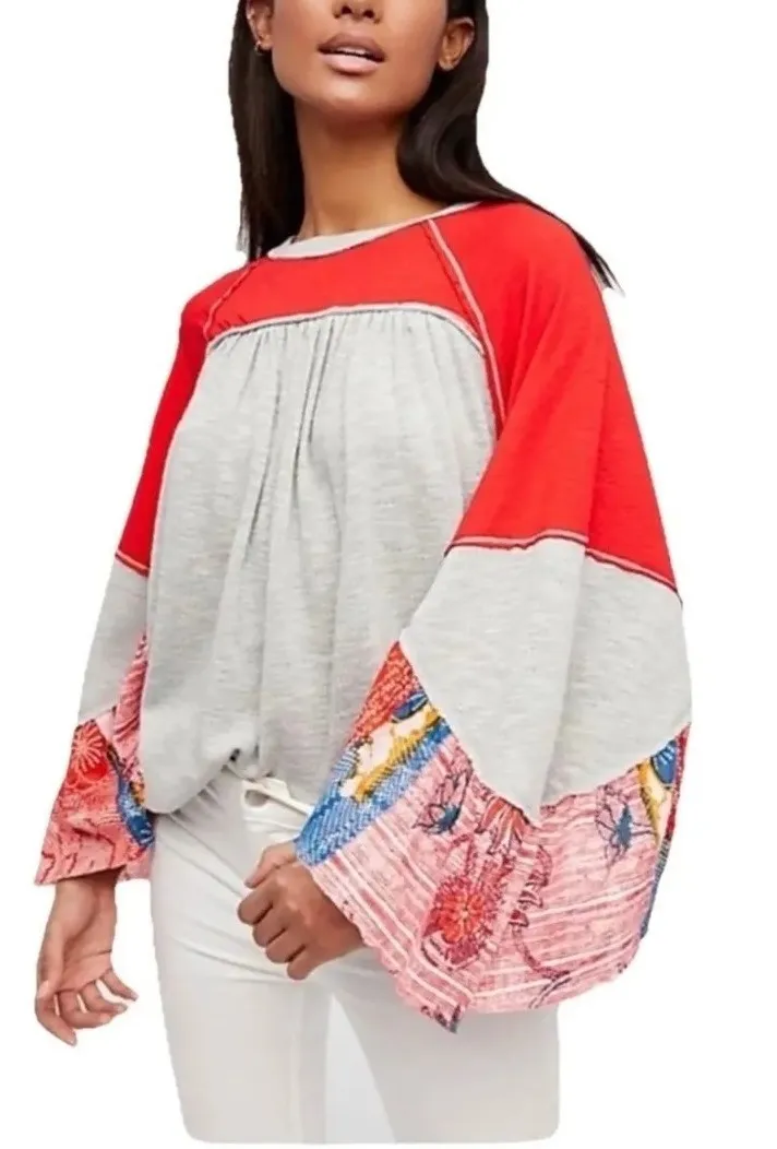 Embrace bohemian charm with this eye-catching Free People thermal top. Featuring a relaxed silhouette, the top showcases a blend of vibrant red raglan sleeves, a soft gray body, and exquisitely patterned cuffs, creating a visually stunning contrast. The gathered detailing at the yoke adds a touch of femininity, while the billowy sleeves offer a comfortable and stylish fit. Perfect for weekend brunches, casual outings, or cozy evenings at home.