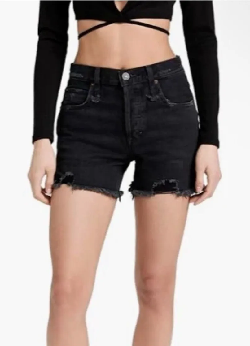 The product is a pair of Free People denim cut-off Makai high-rise jean shorts in black, size 27. Ma... Show more