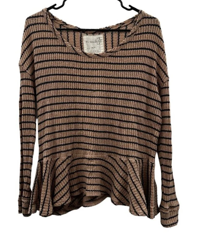 We The Free People Oversized Tan & Black Striped Waffle Knit Peplum Top Long sleeves Scoop neck wit... Show more